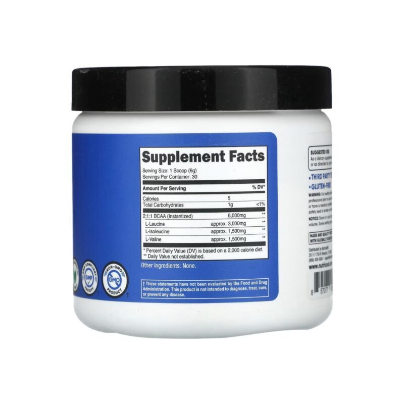 El suplemento Nutricost BCAA (180 g) proporciona 30 servicios de aminoácidos de cadena ramificada (por porción) en proporción 2:1:1 para apoyar la recuperación y el crecimiento muscular. Es un polvo sin sabor, apto para veganos, sin gluten y sin OGM, fabricado bajo normas GMP y regulaciones de la FDA.